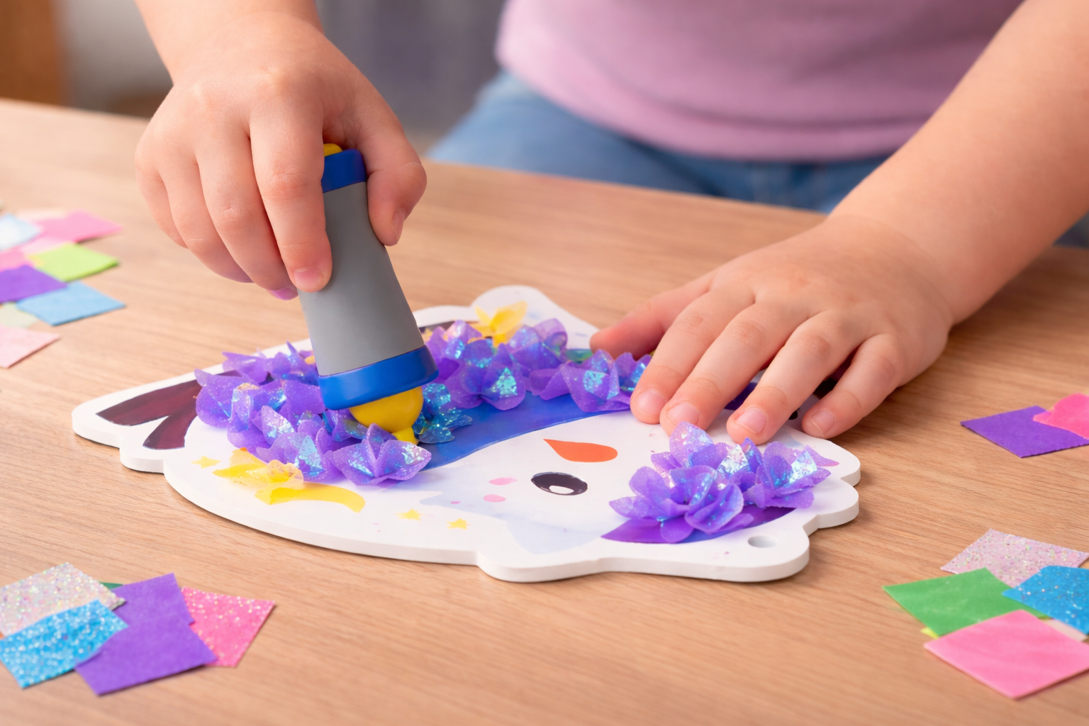Hello, little creator! 🌟 With your Tufting Kit, you’ll insert colorful paper pieces into the prepared design and, step by step, create a 3D picture – completely without glue, scissors, or mess. Choose a design (an animal, a colorful rainbow, or flowers), then use the tool to push the colorful pieces into the right spots. Each piece adds a part of the picture – in the end, a colorful artwork is created that you can be proud of. 🌈