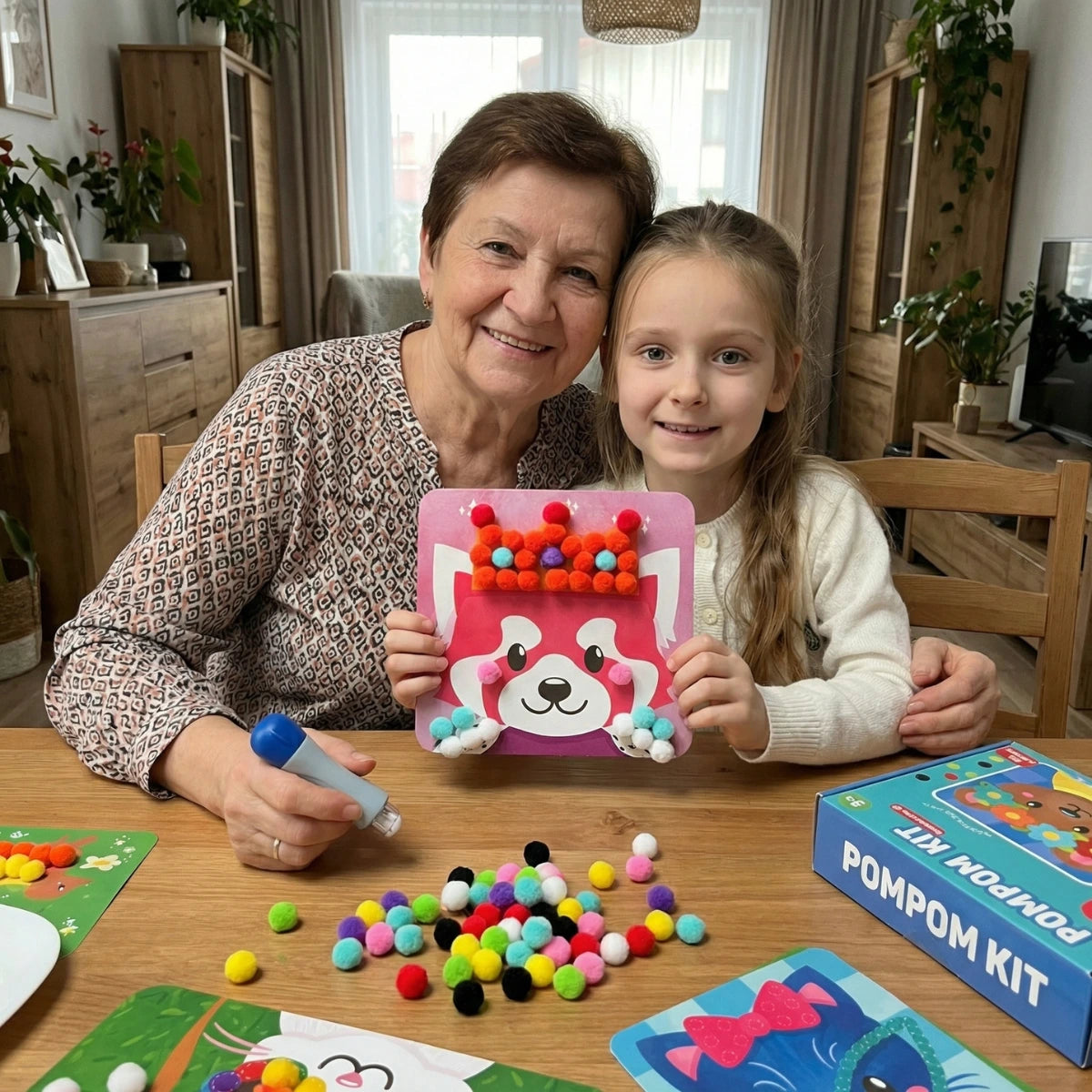 Say goodbye to the mess and stress that often come with other creative toys! With a tool specially designed for small hands, children can easily place pom poms onto animal-themed cards and create soft, colorful 3D artworks—without glue, scissors, or mess. Once decorated, the cards can be instantly displayed using the built-in loops at the top. This sensory play experience enhances tactile awareness, visual recognition of colors and patterns, and helps build concentration, patience, and confidence.
