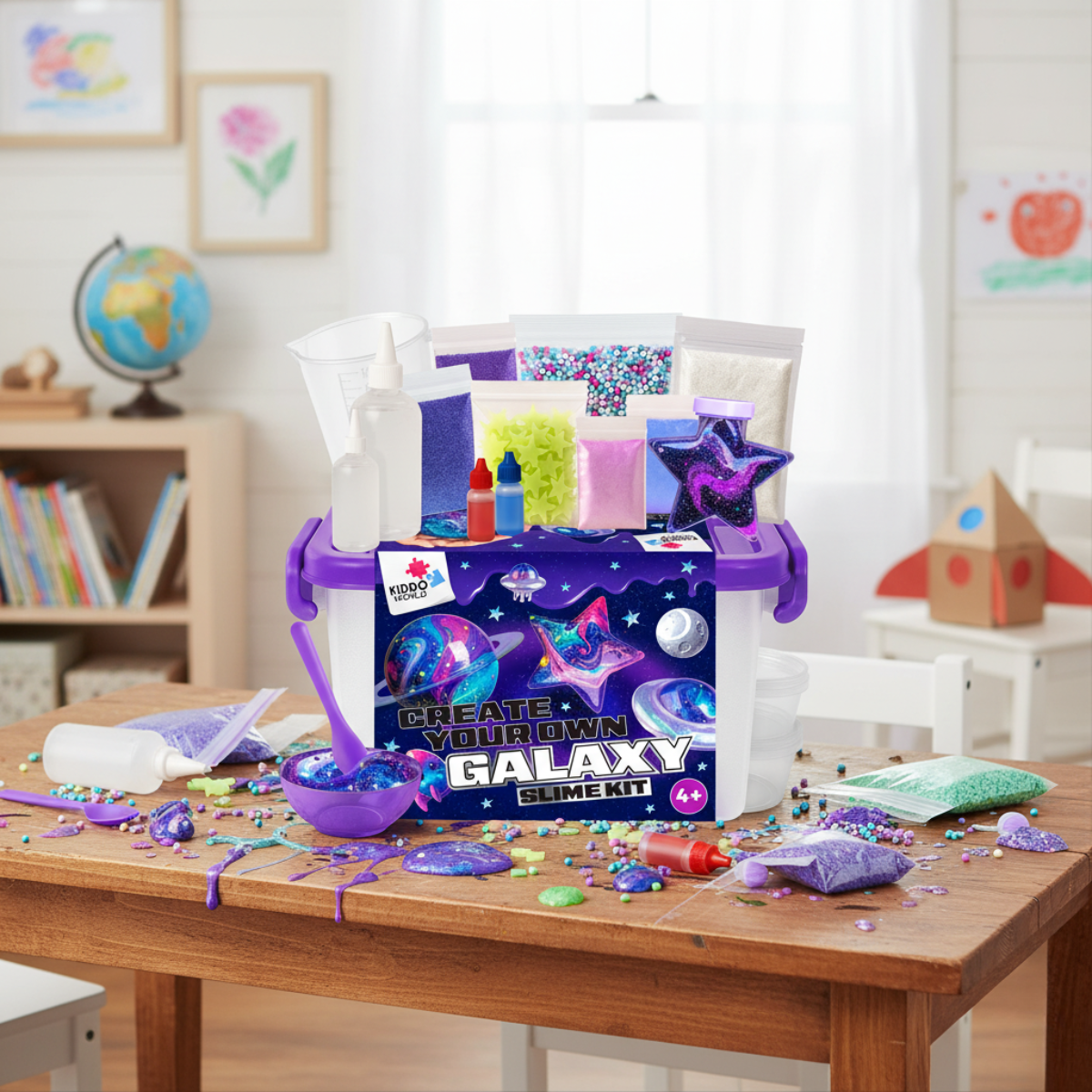 Galaxy Slime Kit is more than just a toy – kids love mixing colors, glitter, and magic while creating their own galaxy slime, developing imagination, fine motor skills, and sensory abilities along the way.